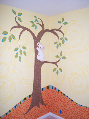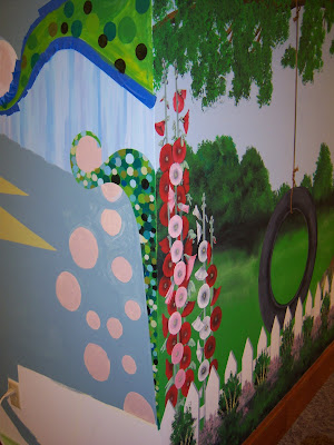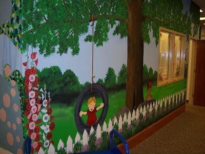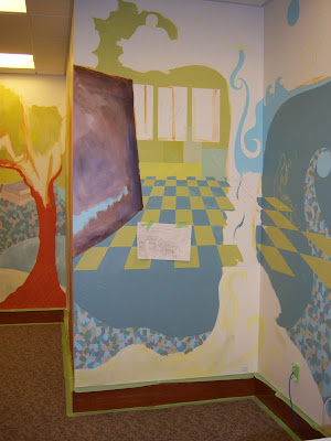 I should have been working at the library, but this was a fun mural to work on. Friday Heather's mom helped me get the basic colors on the walls and start the swirls and the trees.