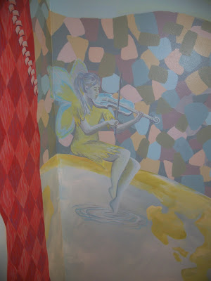 Several people have asked me where I get my ideas- I wanted to include music in this mural and when I sketched her on the earth I hadn't really thought about the ripples of water by her feet- got that idea from one of the ladies at the library. Thanks Diane...that's just what it needed. Then, I was tired of making decisions so I called Tracy and she said "Yes, the figure should have fairy wings, and no, not pointy ears, just normal ones." Thanks Tracy.