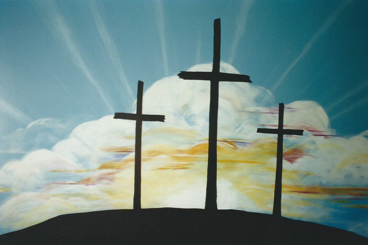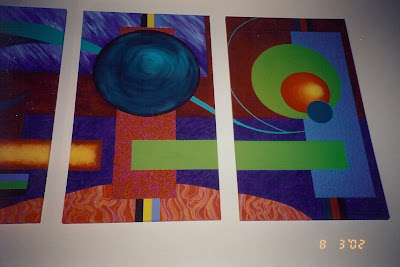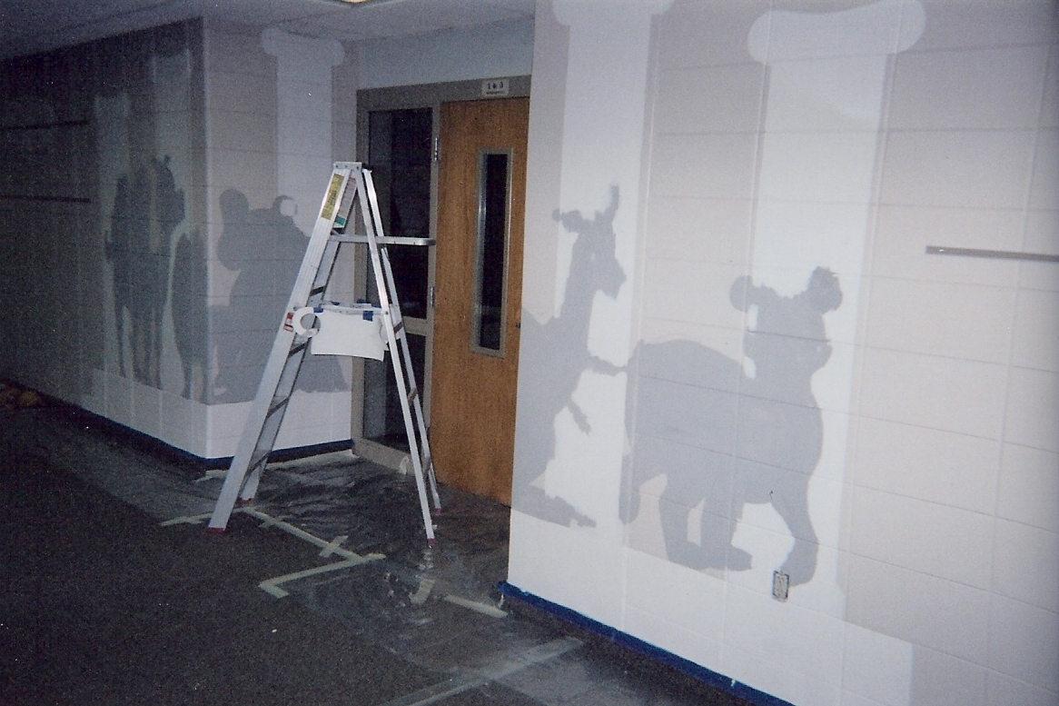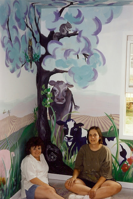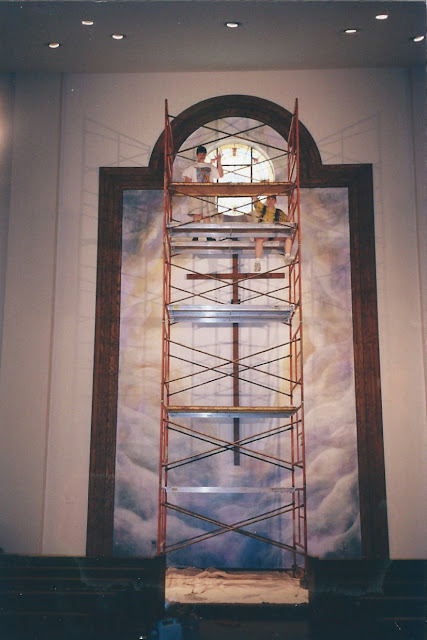 Becky Loudermilk and I worked together on this church alter mural in Sullivan, Indiana. They had a great stereo system in the church so that we could crank up the tunes and crank out this painting job in 4 days time. That included setting up the scaffolding, and moving the incredibly heavy cross. This effect was created with layers of colored glaze. Every inch of this 16' x 24' mural has 2-5 layers of glaze on it to achieve the light airy look. Long days, hard work, fun times.